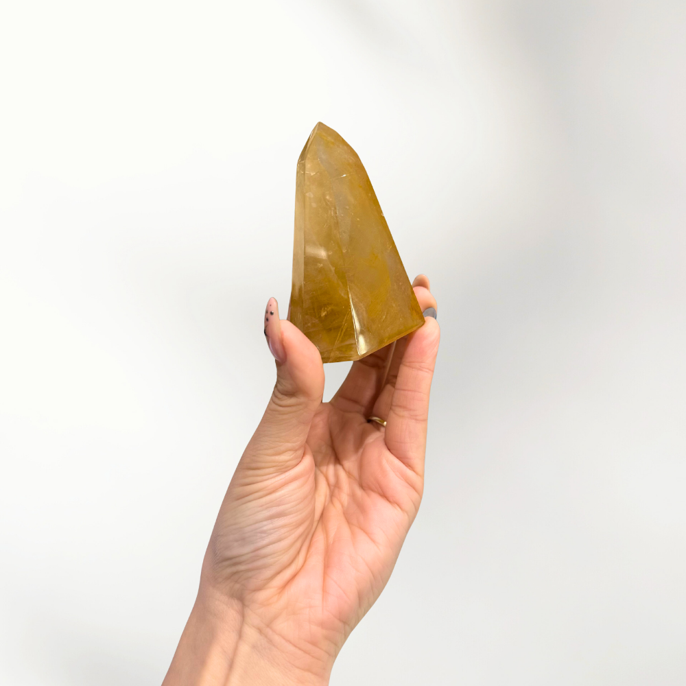 Resonating directly with the Solar Plexus and Crown Chakras it acts as a bridge between the physical and spiritual realms. This alignment allows restorative golden light to flow freely through your aura. Its natural point formation focuses and directs energy making it ideal for manifestation work healing sessions or crystal grids. When used during Full Moon rituals it beautifully amplifies intentions of abundance and personal power.