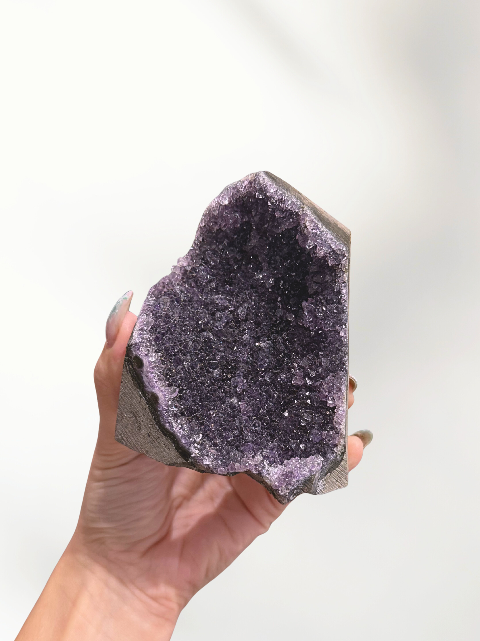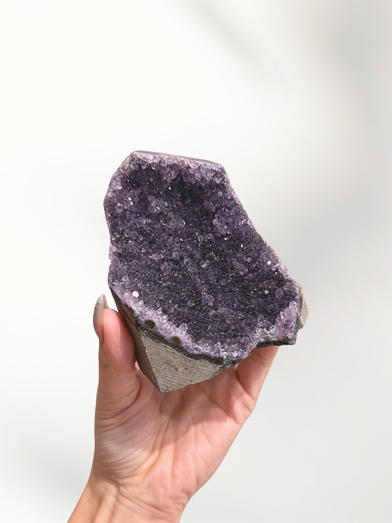 This Amethyst piece from Uruguay features a rich, deep purple druzy centre with strong sparkle and well-formed crystal points.