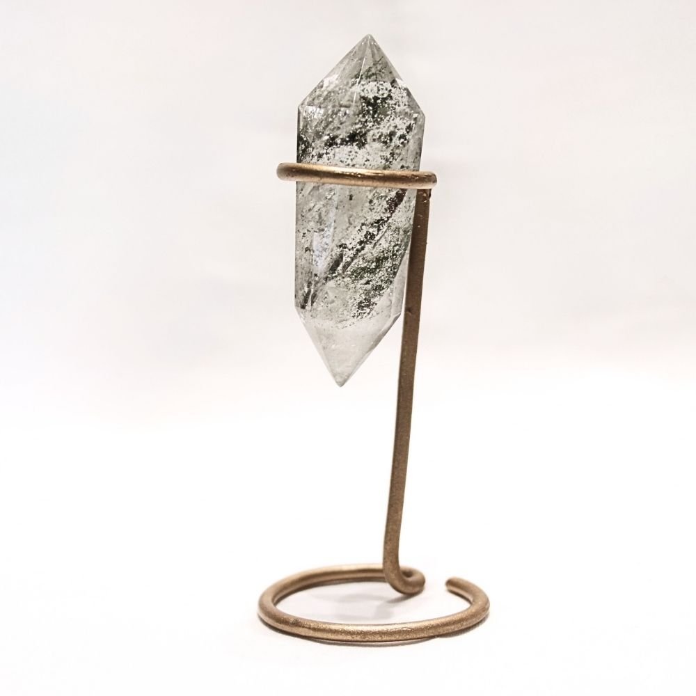 This Chlorite Garden Quartz Vogel is a precision-cut crystal featuring deep green and earthy brown mineral inclusions. These moss-like formations are created by Chlorite and other organic minerals trapped within the quartz, giving the appearance of a dense, natural forest floor or a primitive landscape.