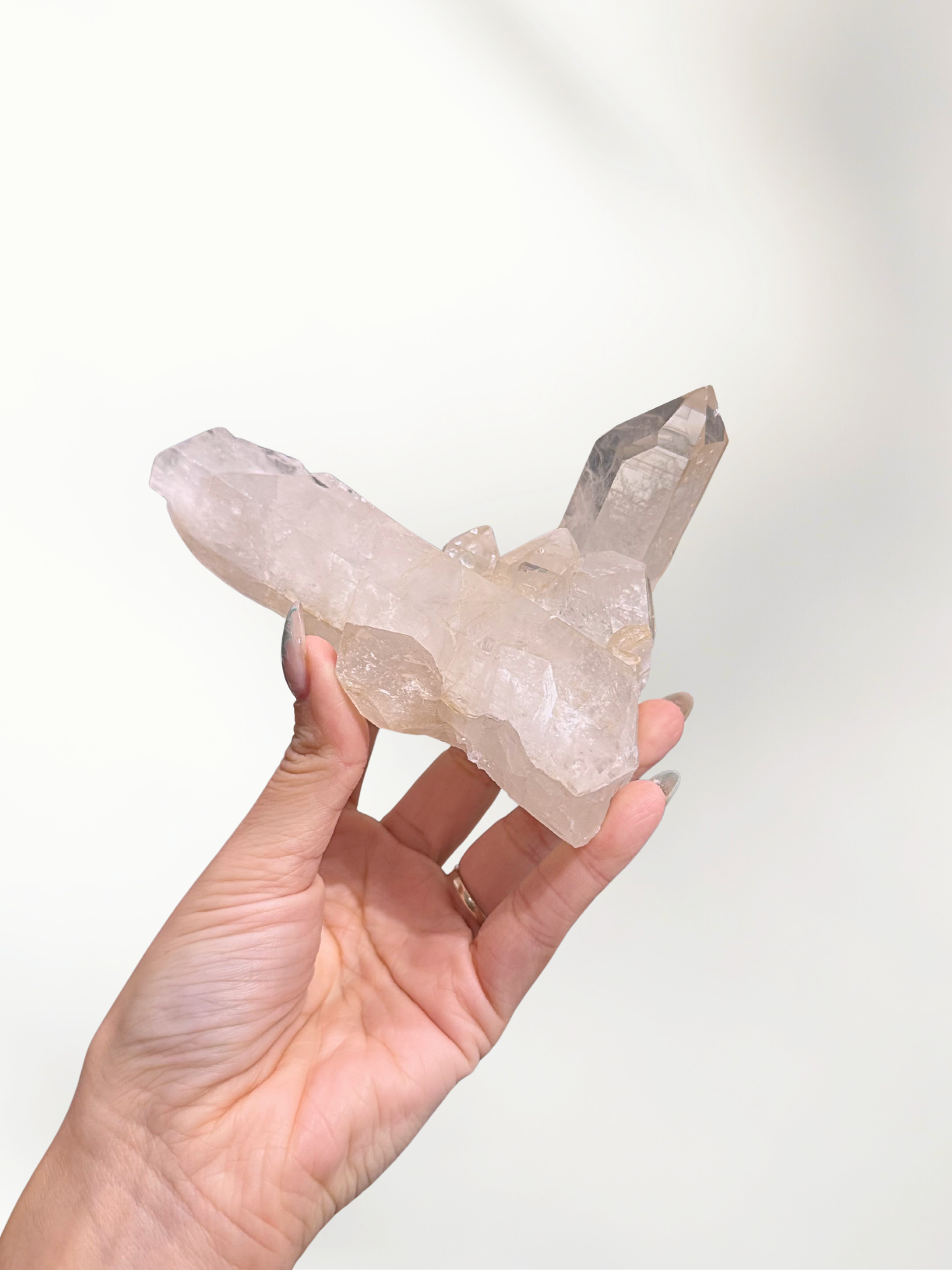 This Clear Quartz cluster features a tall main point with multiple smaller supporting points at the base, creating bright clarity and strong amplification.