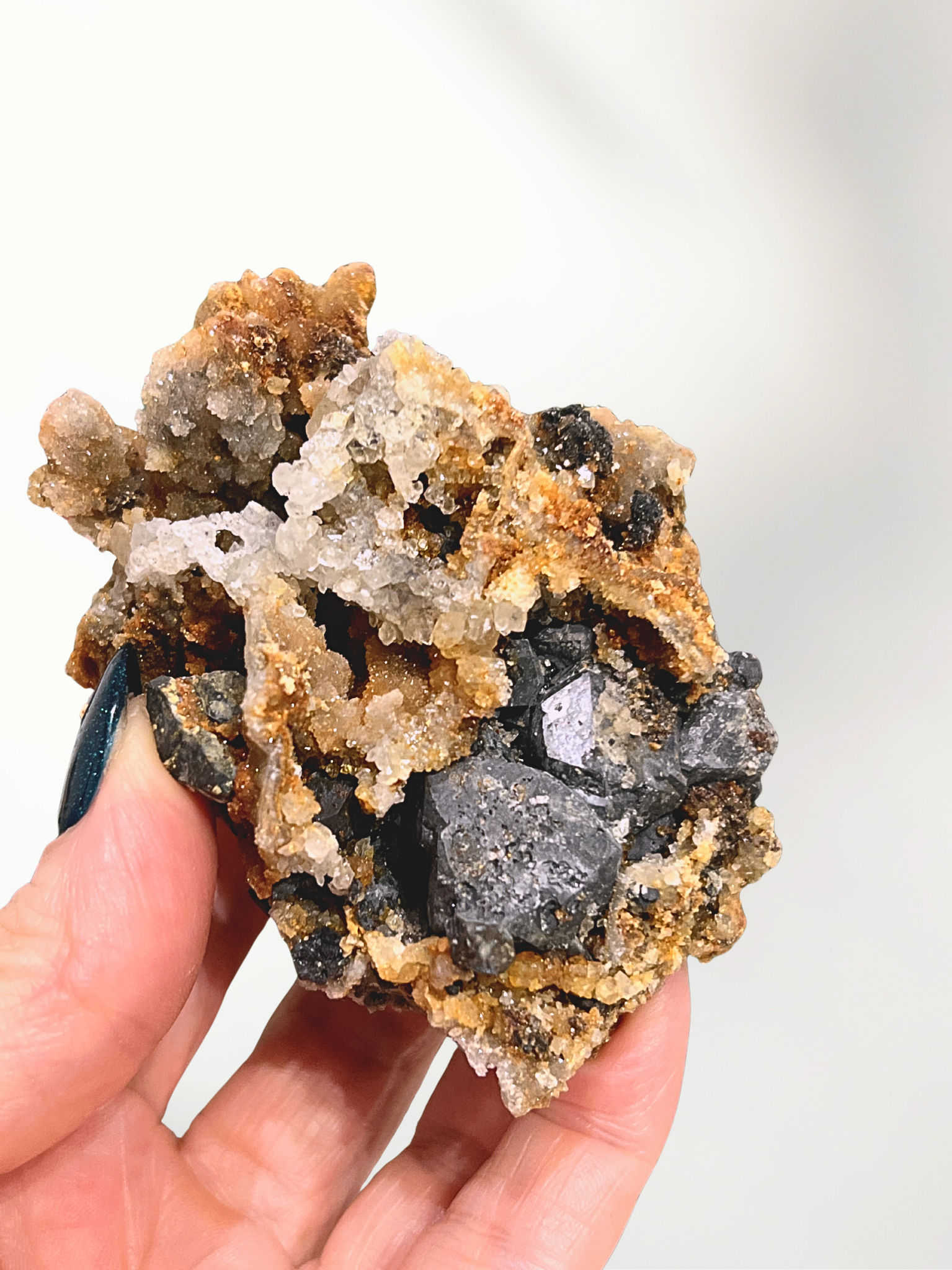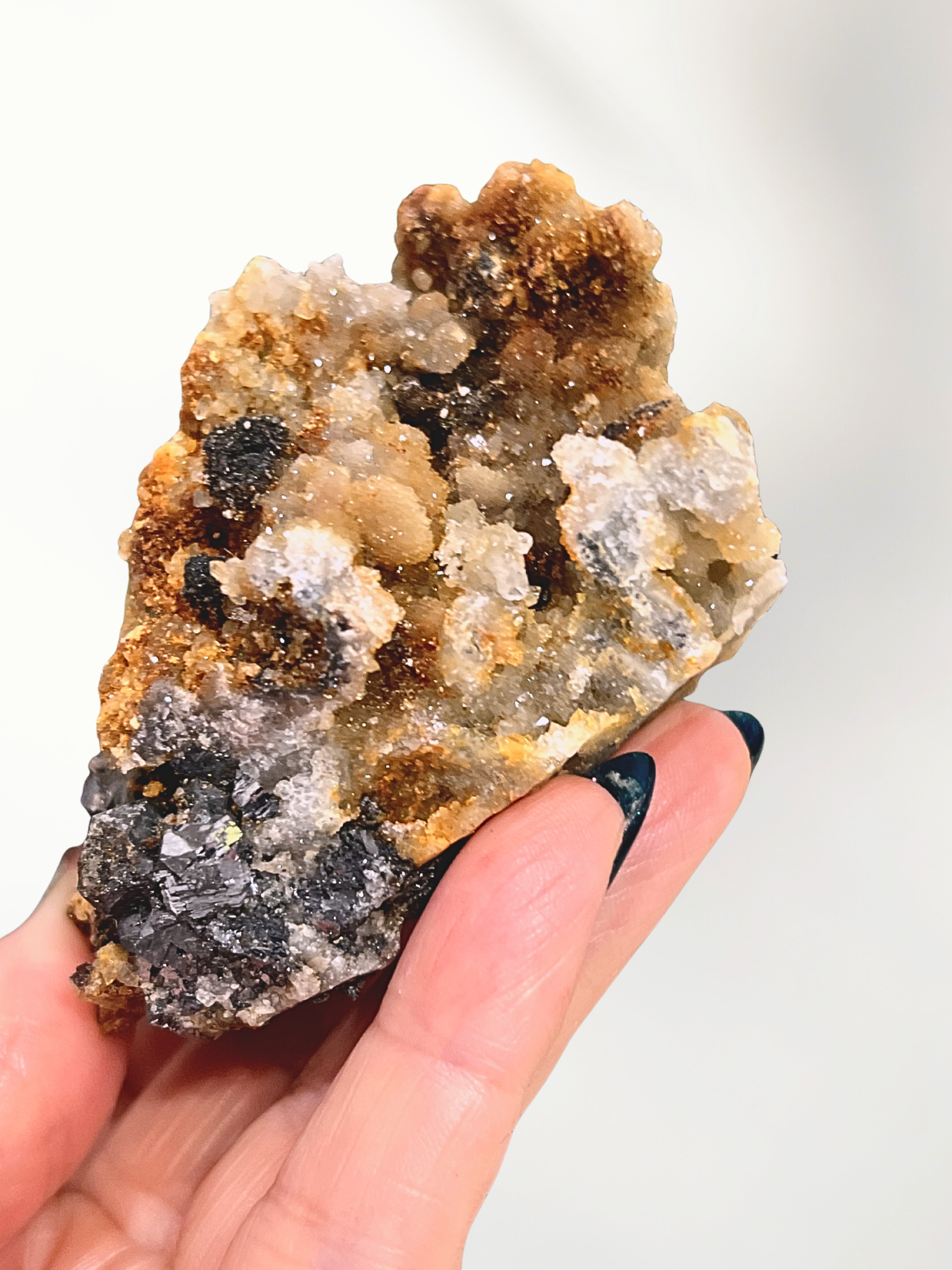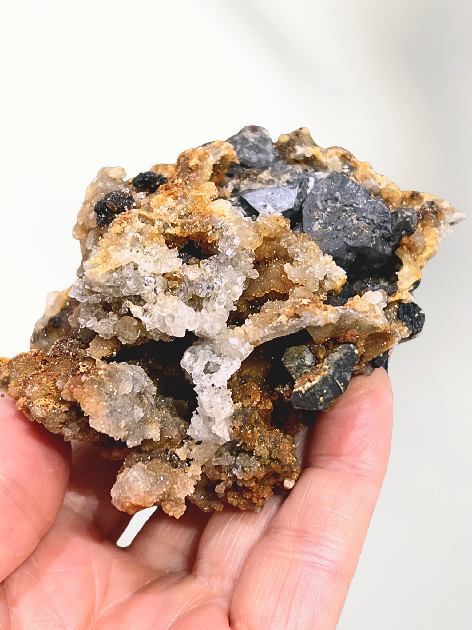 This Galena and Quartz specimen features dense metallic grey Galena cubes surrounded by a sparkling layer of drusy Quartz.