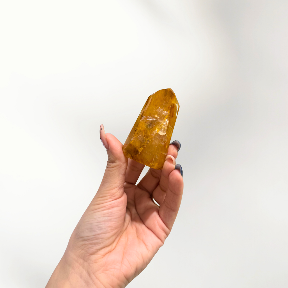 Resonating with the Solar Plexus and Crown Chakras, it acts as a bridge between the physical and spiritual realms, aligning all chakras and allowing restorative golden light to flow through the aura. Its natural point formation focuses and directs energy, making it ideal for manifestation, healing sessions, or grid work.