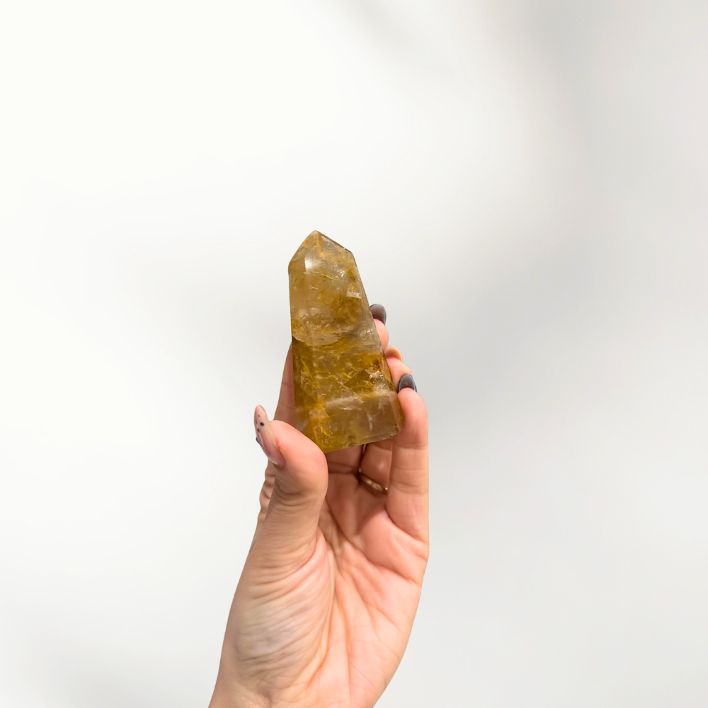 Resonating with the Solar Plexus and Crown Chakras, it acts as a bridge between the physical and spiritual realms, aligning all chakras and allowing restorative golden light to flow through the aura. Its natural point formation focuses and directs energy, making it ideal for manifestation, healing sessions, or grid work.