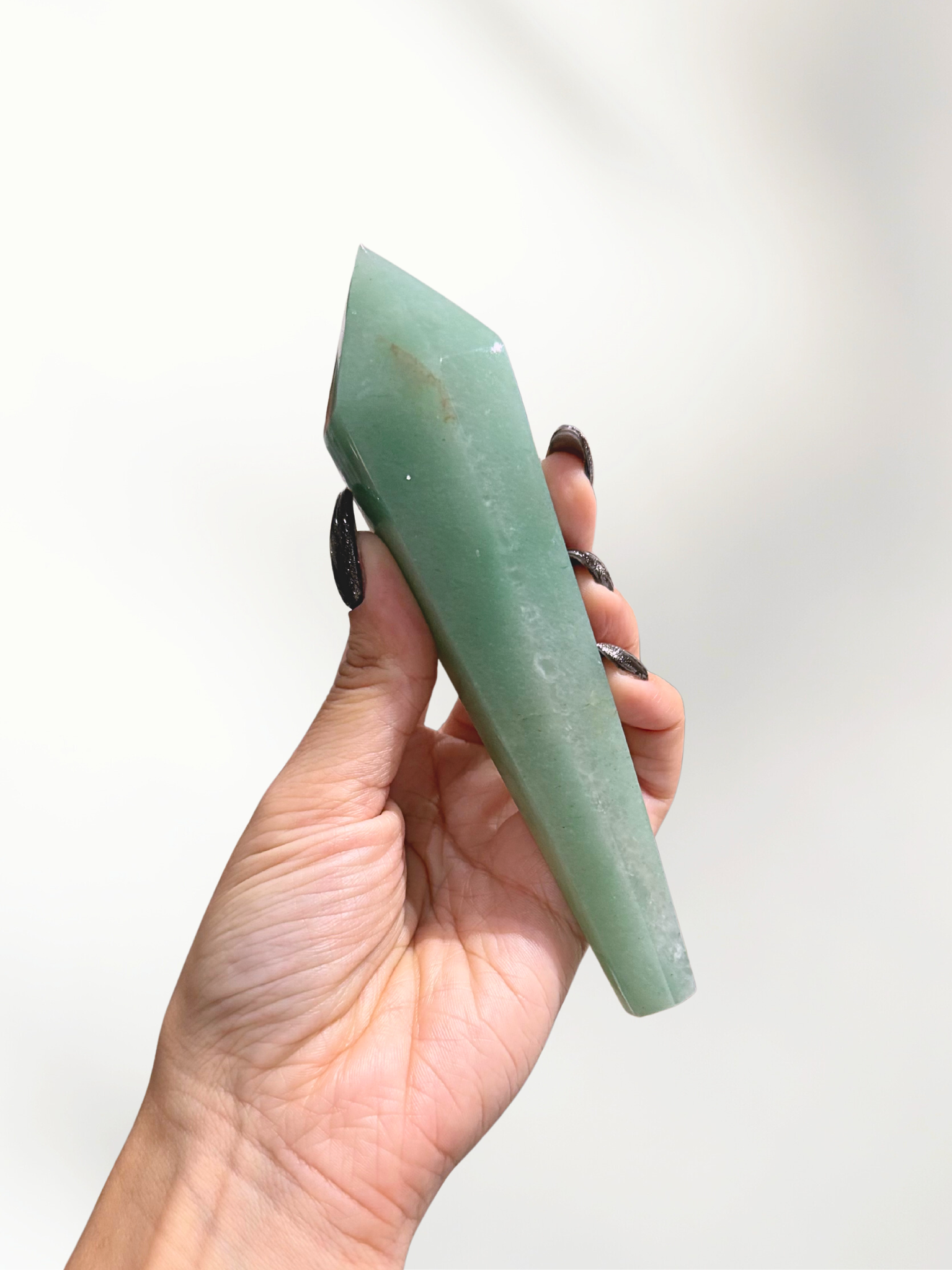 This Green Aventurine wand glows with gentle green hues and a soft shimmer, radiating calm, balanced energy. Known as the Stone of Opportunity, it attracts luck, prosperity, and growth while soothing the heart and mind.
