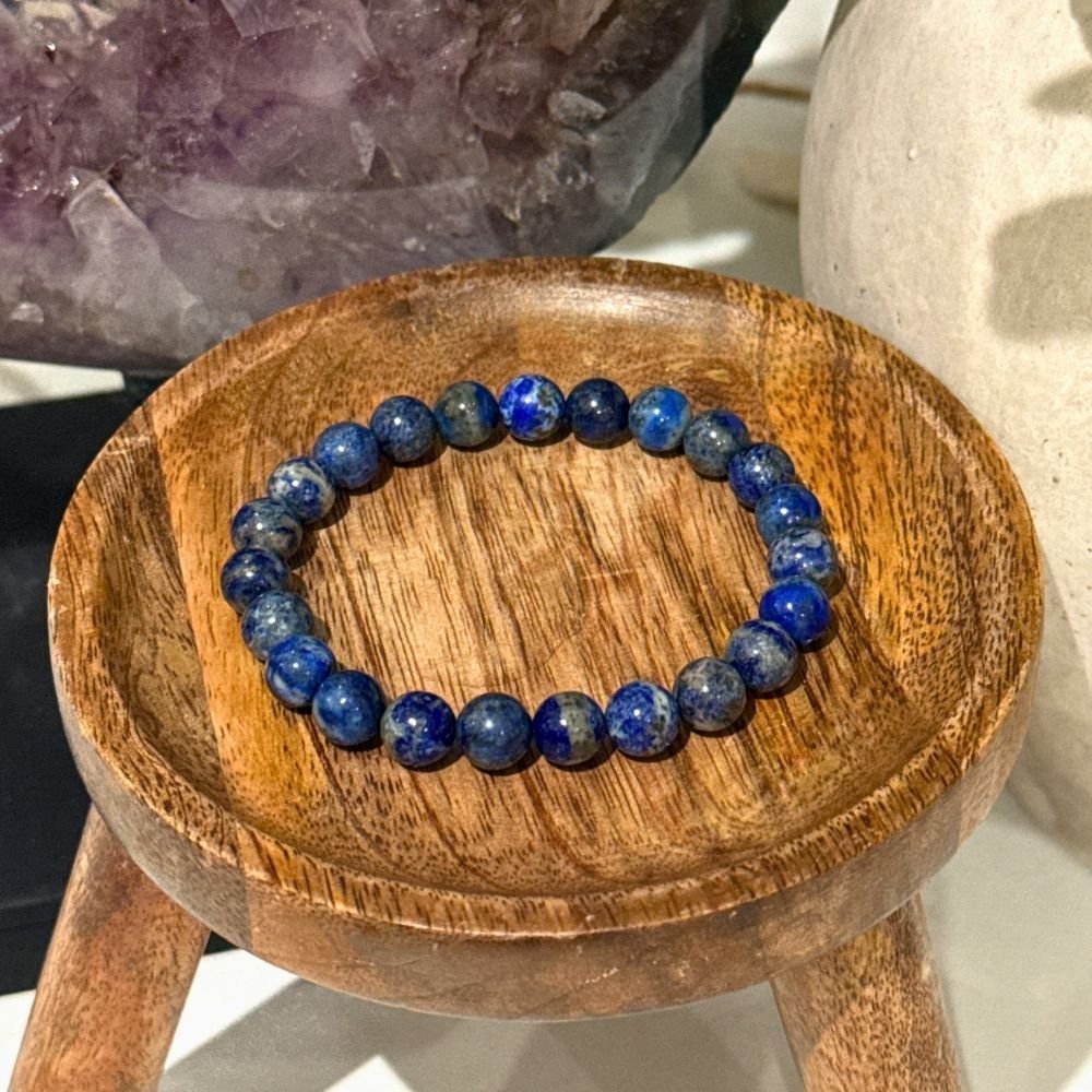 This Lapis Lazuli bracelet carries royal blue hues flecked with gold pyrite that support wisdom, intuition, and clear communication.