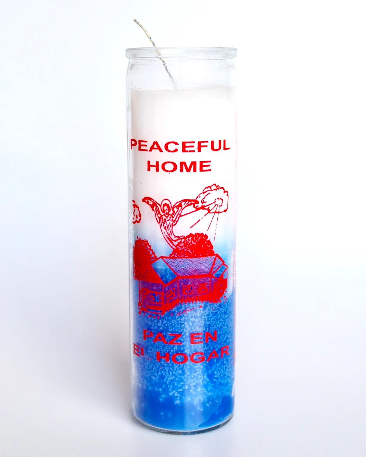Create a sanctuary of calm and harmony with the Peaceful Home Ritual Prayer Candle. Encased in a tall glass holder, this 7-day candle features double-sided screen-printed artwork and bi-colored white and blue wax. Traditionally used in spiritual practices, it supports rituals and intentions aimed at bringing peace, tranquility, and love into your home. Ideal for settling tensions, fostering family unity, or as a thoughtful gift for a new home.
