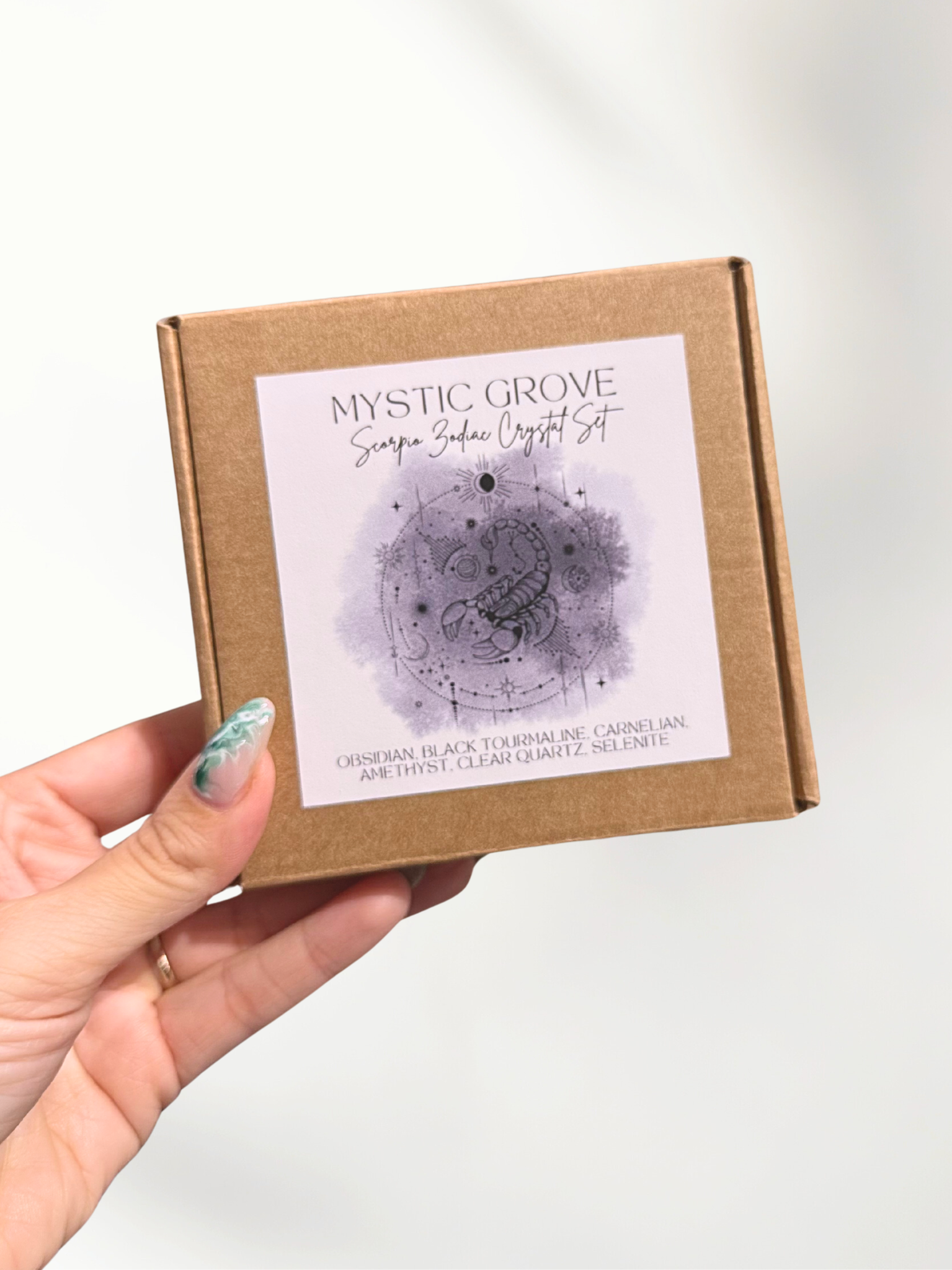 Scorpio Zodiac Crystal Set with 5 stones and a selenite stick. A Mystic Grove collection for protection, transformation, intuition and emotional power. Ideal gift for Scorpio signs.